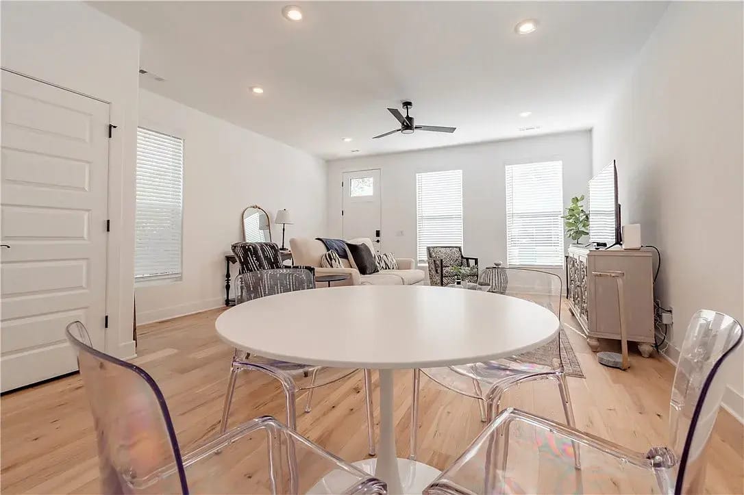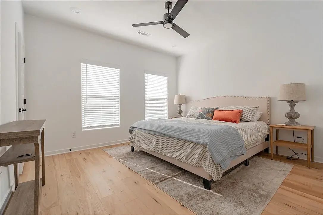 Each unit is 2-bed / 2.5-bath units with an open layout, quartz island kitchens, stainless appliances (with the refrigerator included), and ceiling-height cabinetry finishes aimed at tenants who will pay for “new + close-in.”